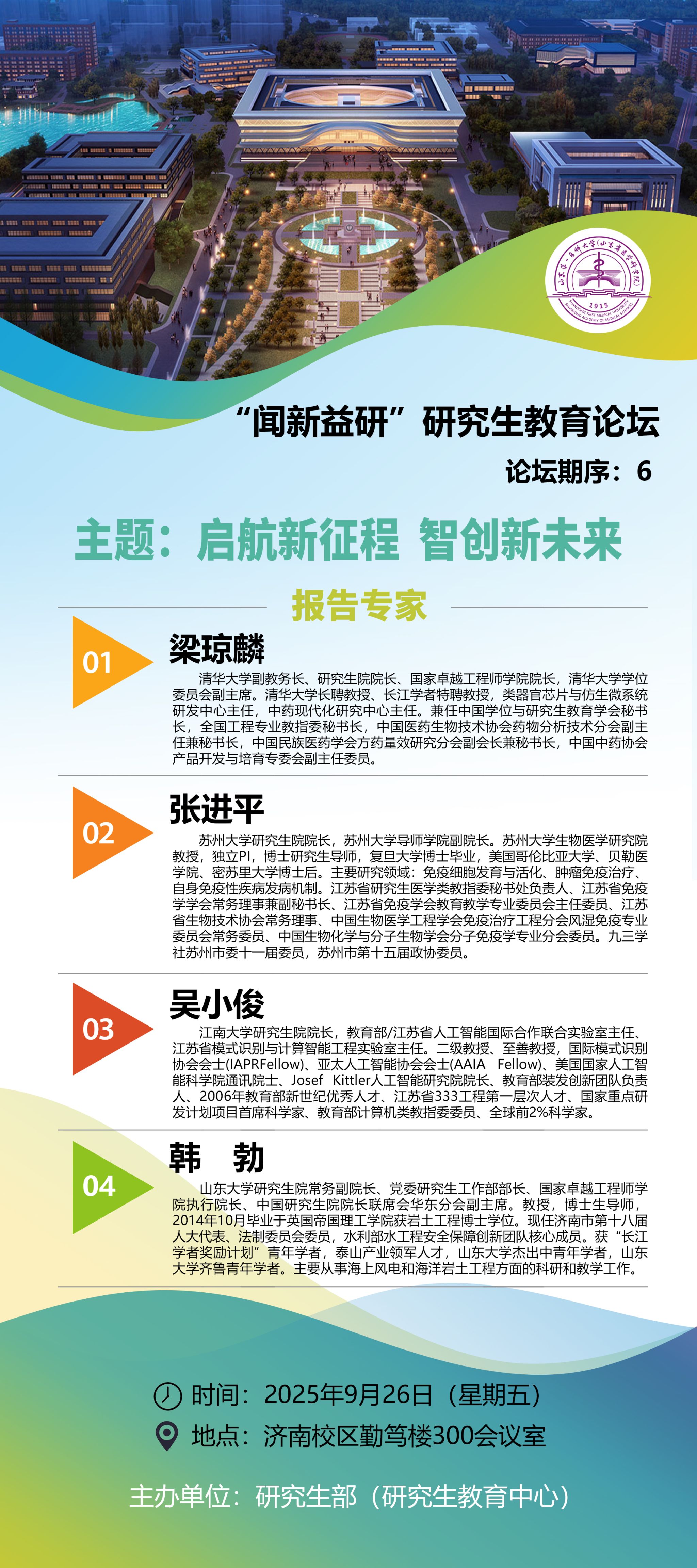 "闻学知新,有益研教"。"闻新益研"寓意"通过讲学研讨,更新研究生教育理念,创新管理方式,有益于研究生教育",是校(院)学位与研究生教育交流的平台。论坛以"实用创新"为内在要求,以校(院)研究生教育重点工作任务为牵引,以拔尖创新人才培养为主线,通过开展聚焦实际问题的讲座和研讨,实现"交流、明辨、借鉴、完善、提升"的人才培养辅助作用,提升学位与研究生教育内涵建设,推进校(院)研究生教育高质量发展。