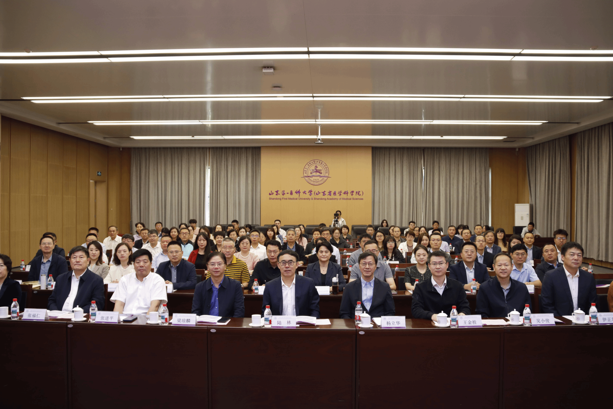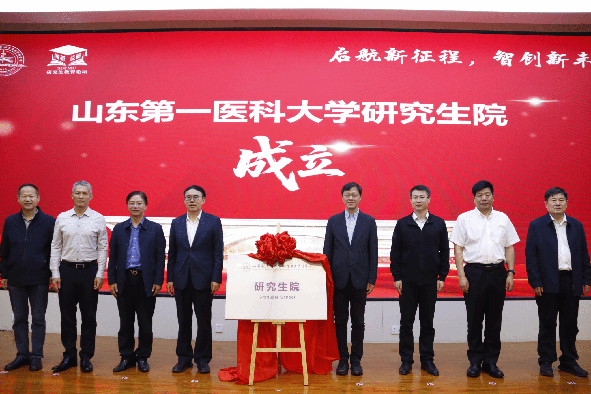 2025年9月26日,山东第一医科大学研究生院成立大会暨“闻新益研”第六期研究生院院长论坛在济南校区隆重举行。本次大会以“启航新征程,智创新未来”为主题,旨在汇聚智慧、交流经验、凝聚共识,共同探讨新形势下医学研究生教育高质量发展的路径与策略。中国科学院院士、山东第一医科大学(山东省医学科学院)校(院)长陆林,中国研究生院院长联席会秘书处、北京大学研究生院副院长杨立华教授,中国学位与研究生教育学会秘书长、清华大学研究生院院长梁琼麟教授,山东省教育厅学位管理与研究生教育处王金桂副处长,中国研究生院院长联席会华东分会副主席、山东大学研究生院常务副院长韩勃教授,中国研究生院院长联席会华东分会副主席、苏州大学研究生院院长张进平教授,江南大学研究生院院长吴小俊教授出席活动。与会领导与嘉宾共同为“山东第一医科大学(山东省医学科学院)研究生院”揭牌。党委委员、副校(院)长马鲁豫主持活动。