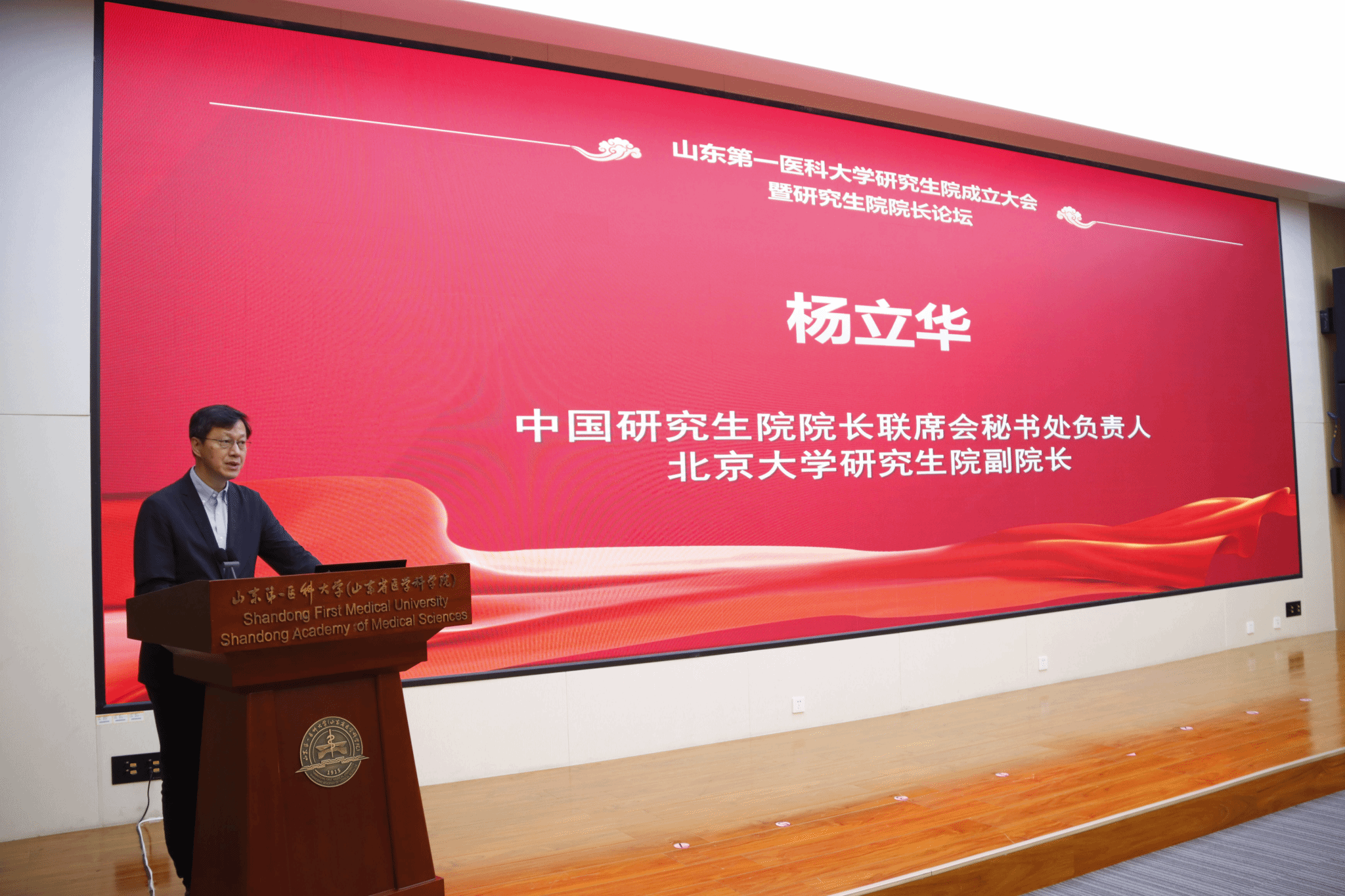 杨立华在致辞中代表中国研究生院院长联席会对研究生院的成立表示祝贺,讲到校(院)在研究生部期间就与院长联席会保持密切联系并提供了山一大视角,希望在研究生院成立后,为全国医学类研究生教育提供更多宝贵的山一大经验。